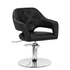 A lapos, kör alakú alap garantálja a stabilitást használat közben. A matt fekete szín, sima felületű, elegáns megjelenést kölcsönöz a széknek , könnyen tisztán tartható . A szék teljes forgási mechanizmusa hatékonyabbá és kényelmesebbé teszi a fodrász munkáját. Kényelmes, habszivacs töltetű ülés nagyfokú használati kényelmet biztosít még sokórás kezelés alatt is. A karfák lehetővé teszik a vendég vállainak helyes elhelyezését – ez biztosítja, hogy a vendég ne dugja a fejét a vállába, ne görnyedjen meg.