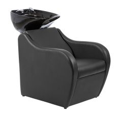 fekete fejmosó, műbőr kárpitozású ülőrésszel. Zuhanyszettel és csapteleppel és nyakvdő gumival. A párnázott ülés és a billenthető fejmosó rész kényelmesen illeszkedik a vendég magasságához.